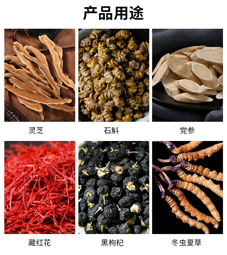 适用范围:灵芝、石斛、党参、藏红花、枸杞、黑枸杞、冬虫夏草等药材